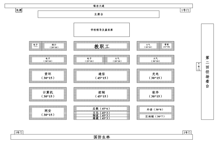 3.各学院领导、教职工、学院邀请的校友及学生代表要在本学院对应区域就坐。
