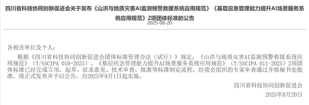 近日,四川省科技协同创新促进会传来喜讯,《山洪与地质灾害AI监测预警救援系统应用规范》(T/SSCIPA 010 - 2025)和《基层应急管理能力提升AI场景服务系统应用规范》(T/SSCIPA 011 - 2025)两项团体标准正式发布,将于2025年9月1日起实施,标志着四川AI赋能应急管理领域迈上新台阶。