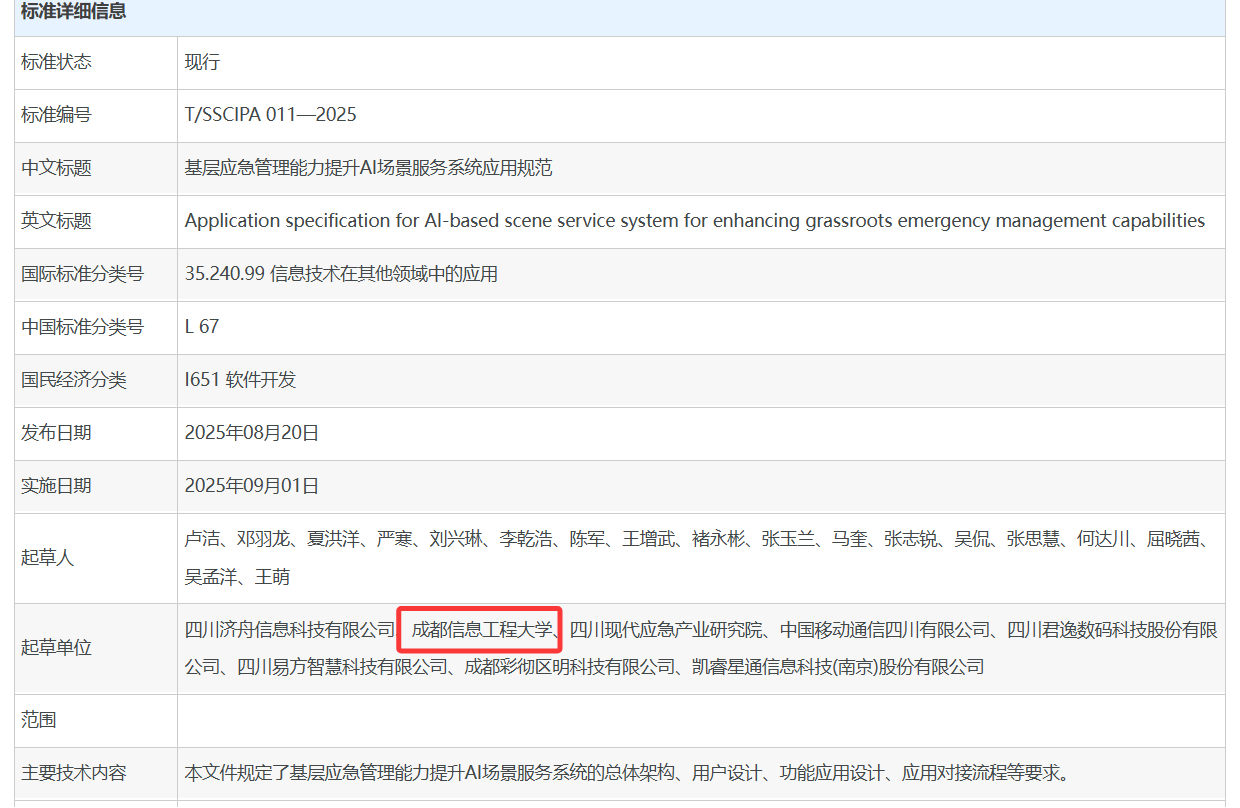 在此,热烈祝贺两项标准发布!期待其落地实施后,为四川应急管理体系注入创新活力,引领行业规范发展,以科技力量筑牢安全屏障,守护群众生命财产安全,为区域安全发展写下生动注脚,也为全国AI应急应用提供“四川经验” ,推动应急管理科技协同创新迈向新高度!