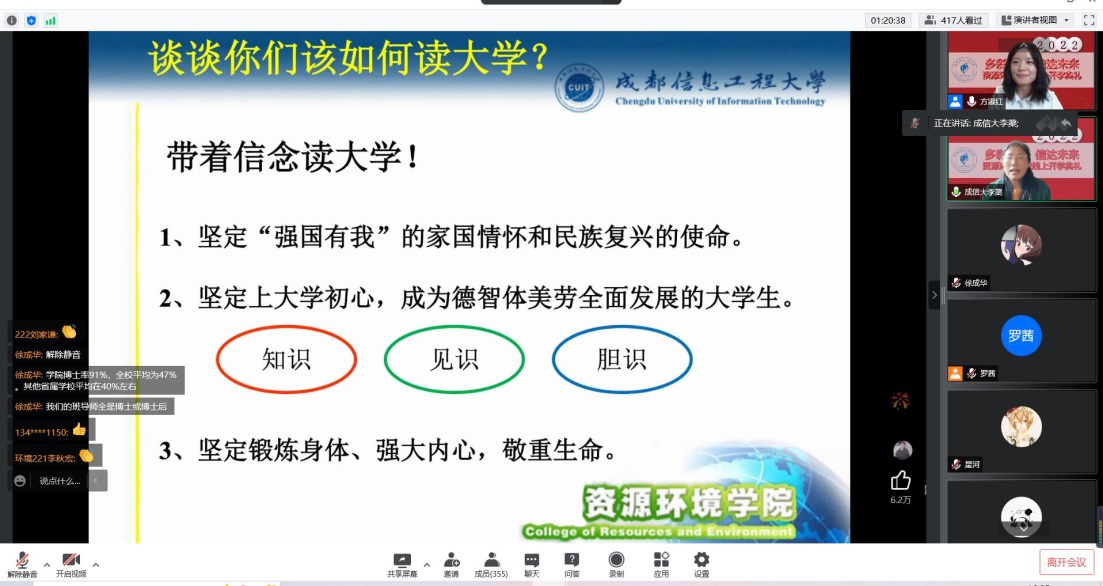 【本网讯】2022年9月16日15时,成都信息工程大学航空港校区Betway体育西汉姆联在腾讯会议召开了2022级新生开学典礼。首先,主持人方淑红老师宣布典礼正式开始并进行大会第一项:全体起立,奏唱国歌!全体师生起立,大声唱响国歌,典礼在庄严的国歌声中拉开序幕。