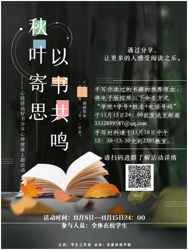 本次活动同学们积极参与,将自己的读书心得分享出来,让越来越多的同学体会到书籍的魅力。古人云“读万卷书,行万里路”,虽说疫情当下“行万里路”受到了限制,但同学们可以通过读书的方式来慰藉心灵。本次获奖作品将通过心晴驿站心理工作室微信公众号分享给全校师生,让更多同学了解读书的意义。通过书籍推荐搭建起沟通共鸣的桥梁,在金秋时节漫卷书香中温暖彼此的心灵。